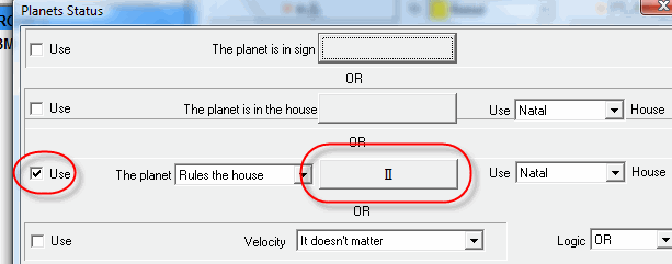 Here we are dealing with another feature of SuperSearch�ULE module. It is called FILTER (planetary status) for Natal planets. Do it this way: