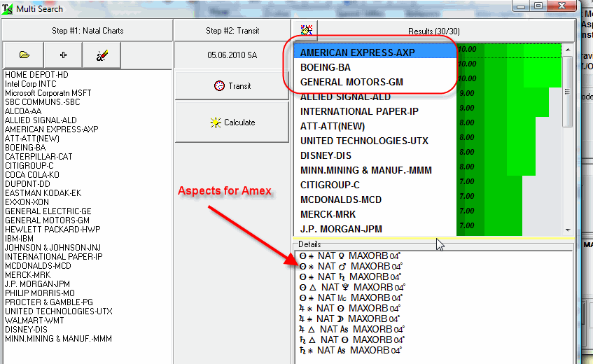 The program chose three the most aspected Natal Charts (Amex, Boeing and GM). Highlighting any of these Natal Charts, you can see all aspects that affect this chart.