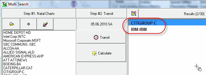 Example #3: Now we need to find among the same data set (30 Blue chips for DJI) those charts that have a Natal ruler of the second house aspected by transiting Jupiter.