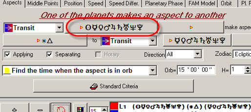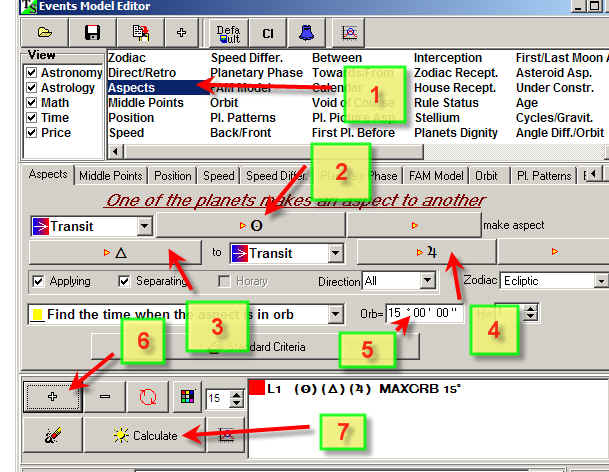 You will get the Model Editor window where you can define easily practically any astrological event. Let it be the event: "the Sun makes a trine to Jupiter with the orb=15 degrees".