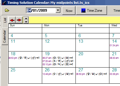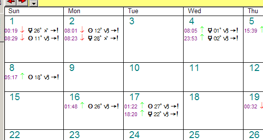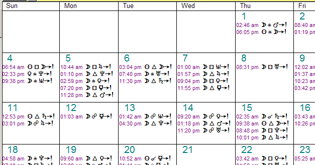 or a calendar of all events (aspects, ingresses, midpoints, direct/retrograde), like this: