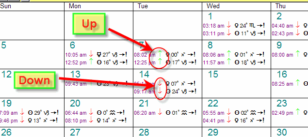 or this calendar that shows the statistical information regarding how these phenomena affect the stock market (green - upward, red -downward):