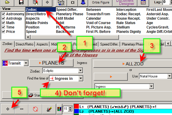 In previous example we have created a list of aspects culminations. Now let's create more detailed table with aspects, ingresses, direct/retrograde and midpoints.