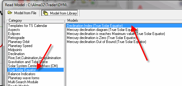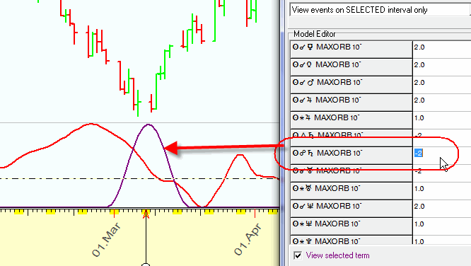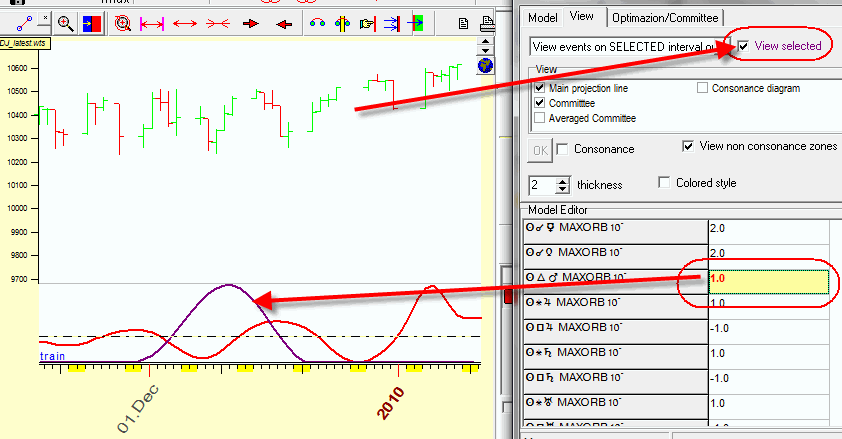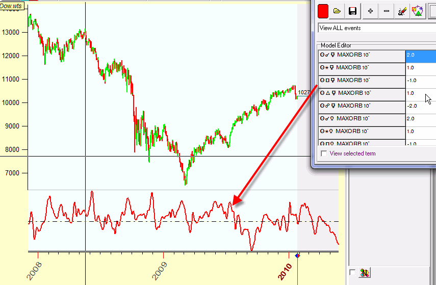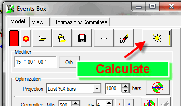 Events Box module allows to design astro based models manually. In Timing Solution there are modules that generate the projection line automatically; they analyze past price history, select automatically the events that play a significant role and assign the most optimal weights for analyzed events. These modules are: Neural Network, Bradley Barometer, Composite.