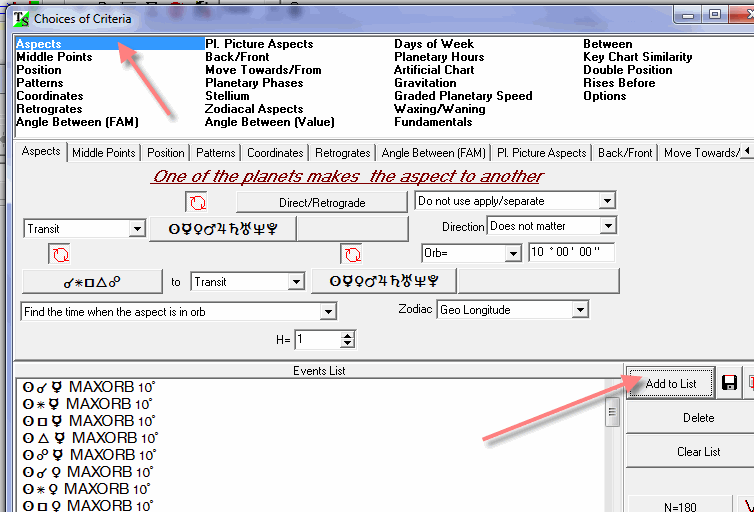 For example, you may create the list of 180 major aspects. Fill in the form this way: