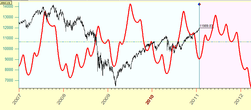 Let's look how this technique works. As an example we will analyze "Heliocentric declination index". The diagram below shows this index together with Dow Jones Industrial Index (red curve):