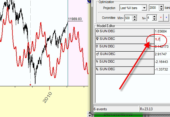 Here we used last 2000 bars to adjust the projection line, in other words the program is looking for the optimal weights for heliocentric declination using last 8 years of the price history (=2000 bars).