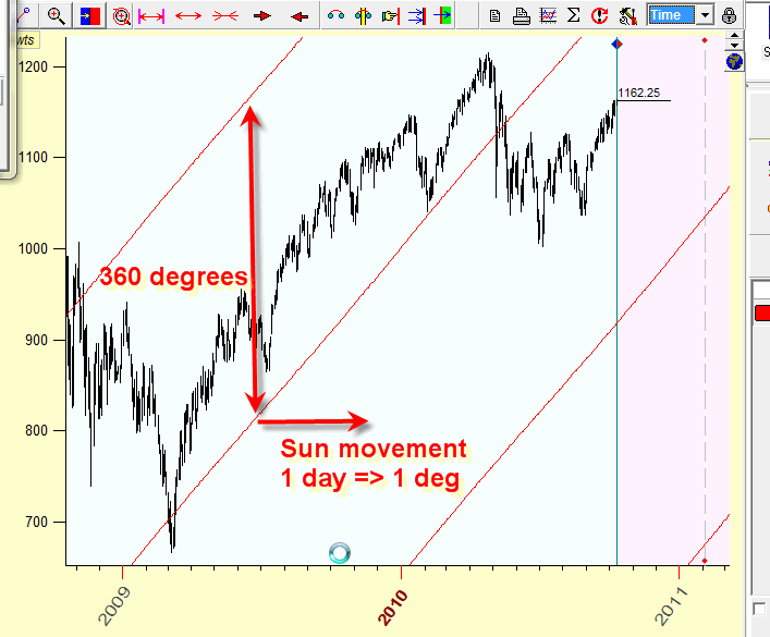 Look at the Sun planetary line. Within one day, the Sun travels approximately 1 degree, it comes to 360 degrees within one year. When creating its planetary line, we assume that 1 degree of the Sun travel corresponds to $1 of price changes. On March 21st, when the Sun ingresses the first degree of Aries. these lines indicate these price levels: $0, $360, $720, $1080 etc. Thus we see here the bunch of planetary lines shifted on $360: