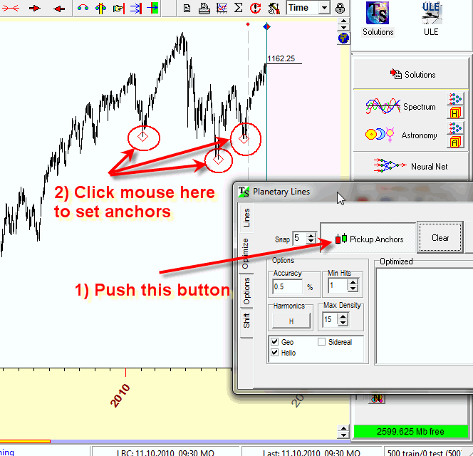 We need to define the anchor points on the price chart. The idea of this module is: we analyze a lot of planetary lines and pick up only those of them that hit our anchors. In other words, we recommend to set the anchors to the important price levels.