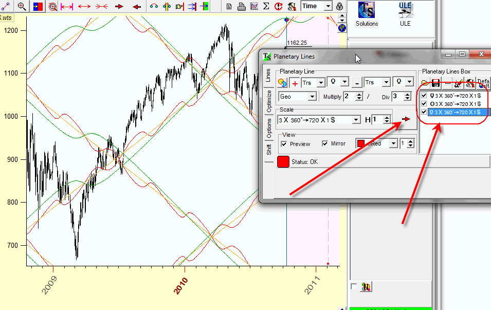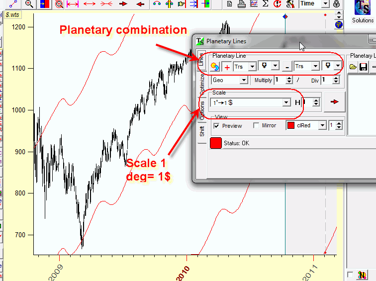 There are controls there that allow to choose the planetary combination. Scale is another very important parameter for planetary lines technique; in the example above we used a scale 1 degree=$1. If we consider Dow Jones index which varies now around 10,000, the more suitable scale is 1 degree=$10. Also it is better to use higher scale for slow planets: