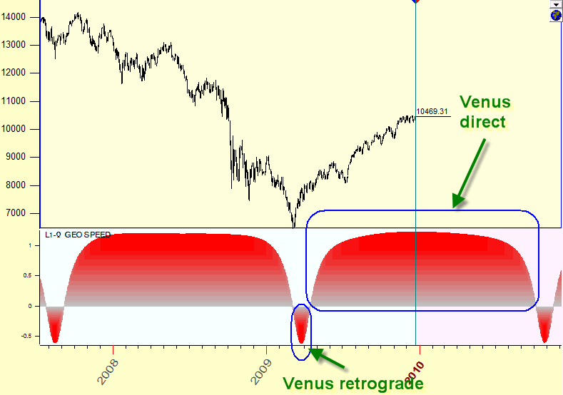 The negative zones of this diagram represent the periods when Venus is retrograde, while positive zones are the periods when Venus is direct.