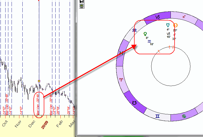 As you see this angle is changing in the range of -70 to +70 degrees. It means that we will never find the moment when this angle has the value of 120 degrees or any degree more than 70. It is so due to the peculiarities of Mercury - Venus movement in respect to each other. Therefore, for inner planets we use plus/minus the notation value notation to define the angles (it is similar to what we do for the declination).