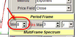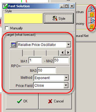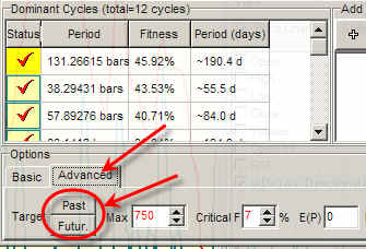 This feature allows to extract dominant cycles for one indicator ("Past" button) and generate a projection line using another indicator ("Future"). For beginners, I recommend to set the same indicators for "Past" and "Future".
