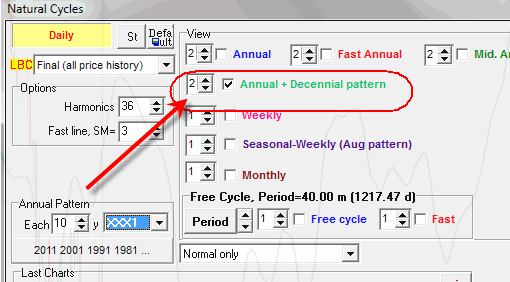 Now is August 2011. To calculate decennial cycle, we use the years 2001, 1991, 1981, ... - all years with XXX1 pattern. In other words we are looking for some analogy between 2011 and 2001, 1991, ... years - that is how we calculate decennial Annual cycle. It is important: we take not the last ten years, but each and every tenth year. Decennial cycle is presented in "Natural cycles" module: