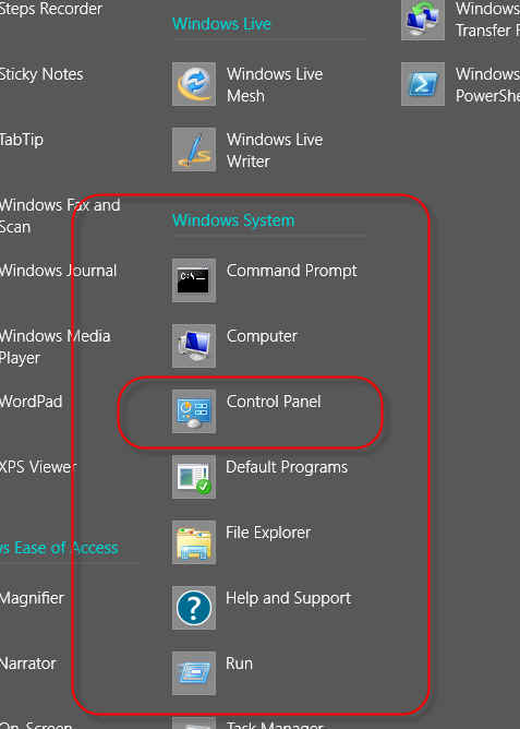 Follow the same way as running Timing Solution, i.e. Start => RIGHT mouse click => click "All applications", there is "Windows System" folder there. Find "Control Panel":