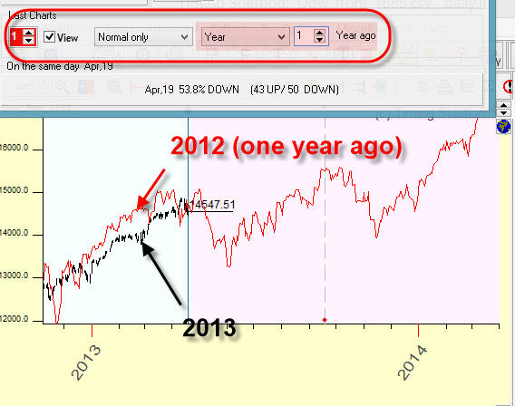 One year ago price chart: i.e. we display the price chart one year ago overlaying the current chart: