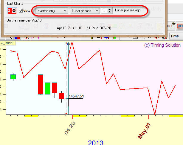Pay attention, we use inversion procedure here, backtesting analysis shows that for some financial instruments inverted Moon cycle works better.