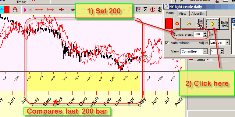 Now the program compares the last 200 bars; the according similarity period is marked by yellow bar.
