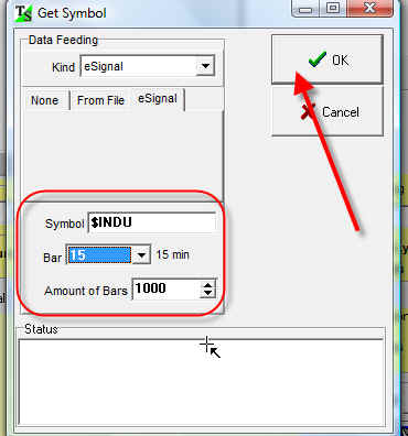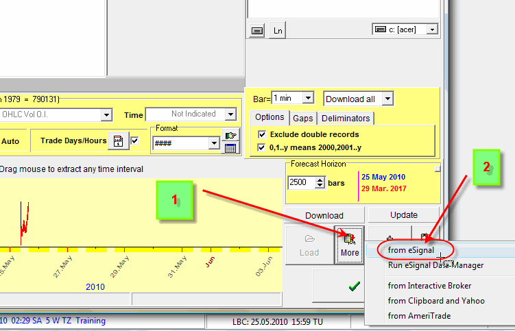 a) Click there "Data manager" button to run e-Signal service. Wait several second while the program will run e-Signal software.